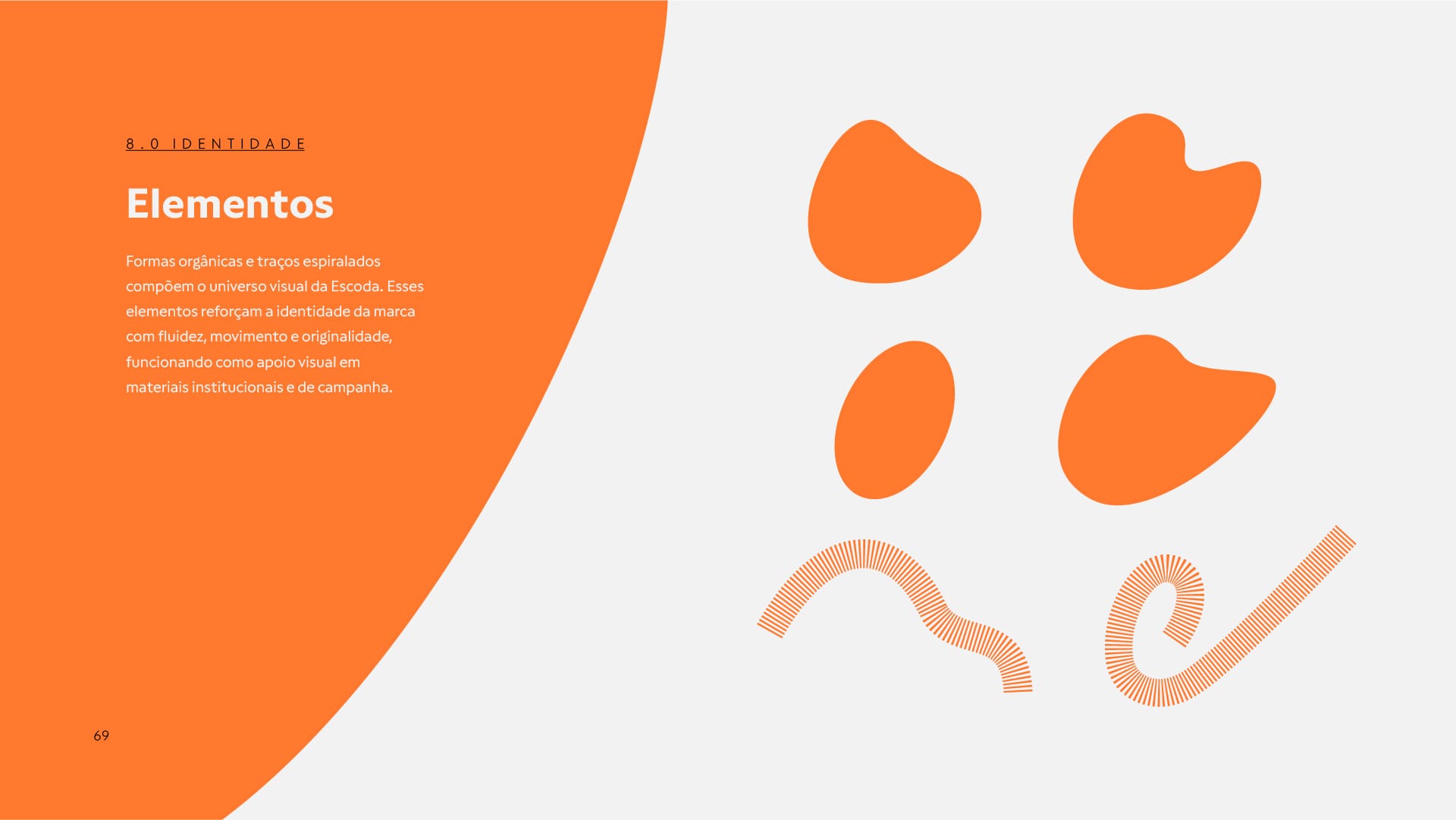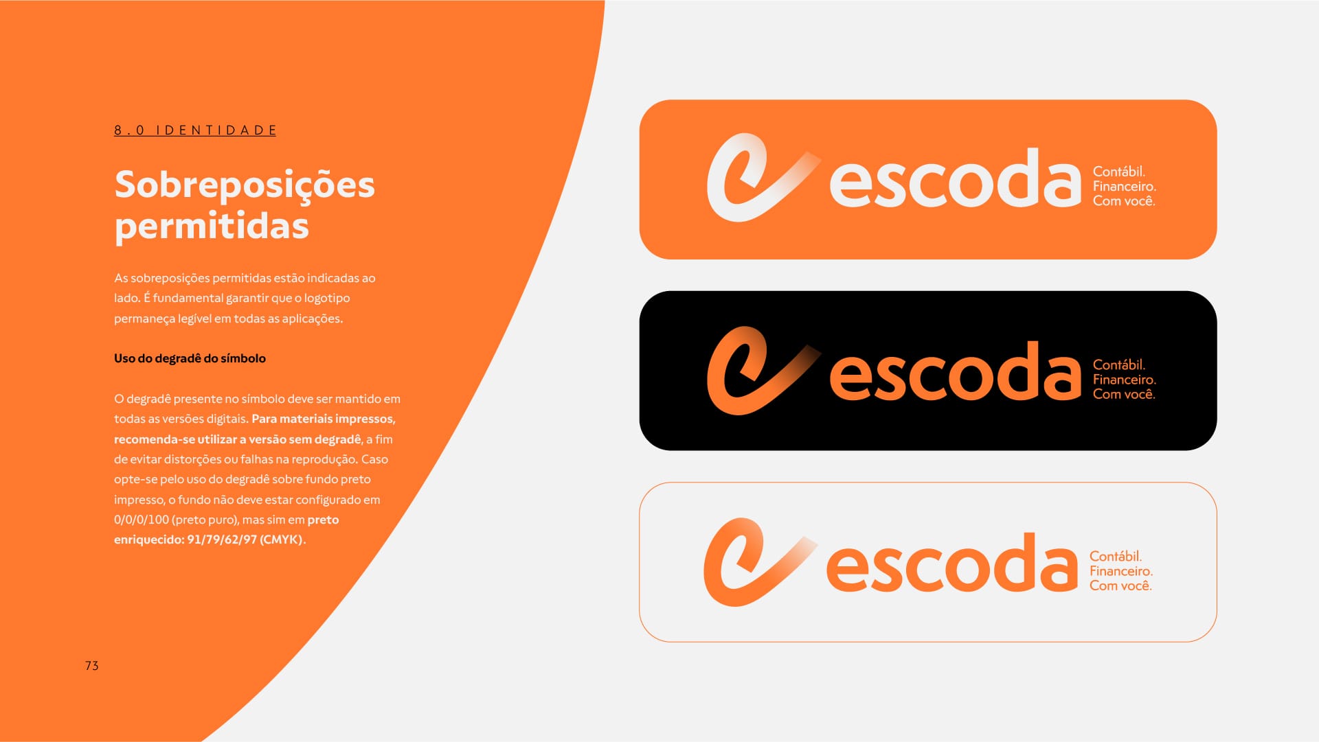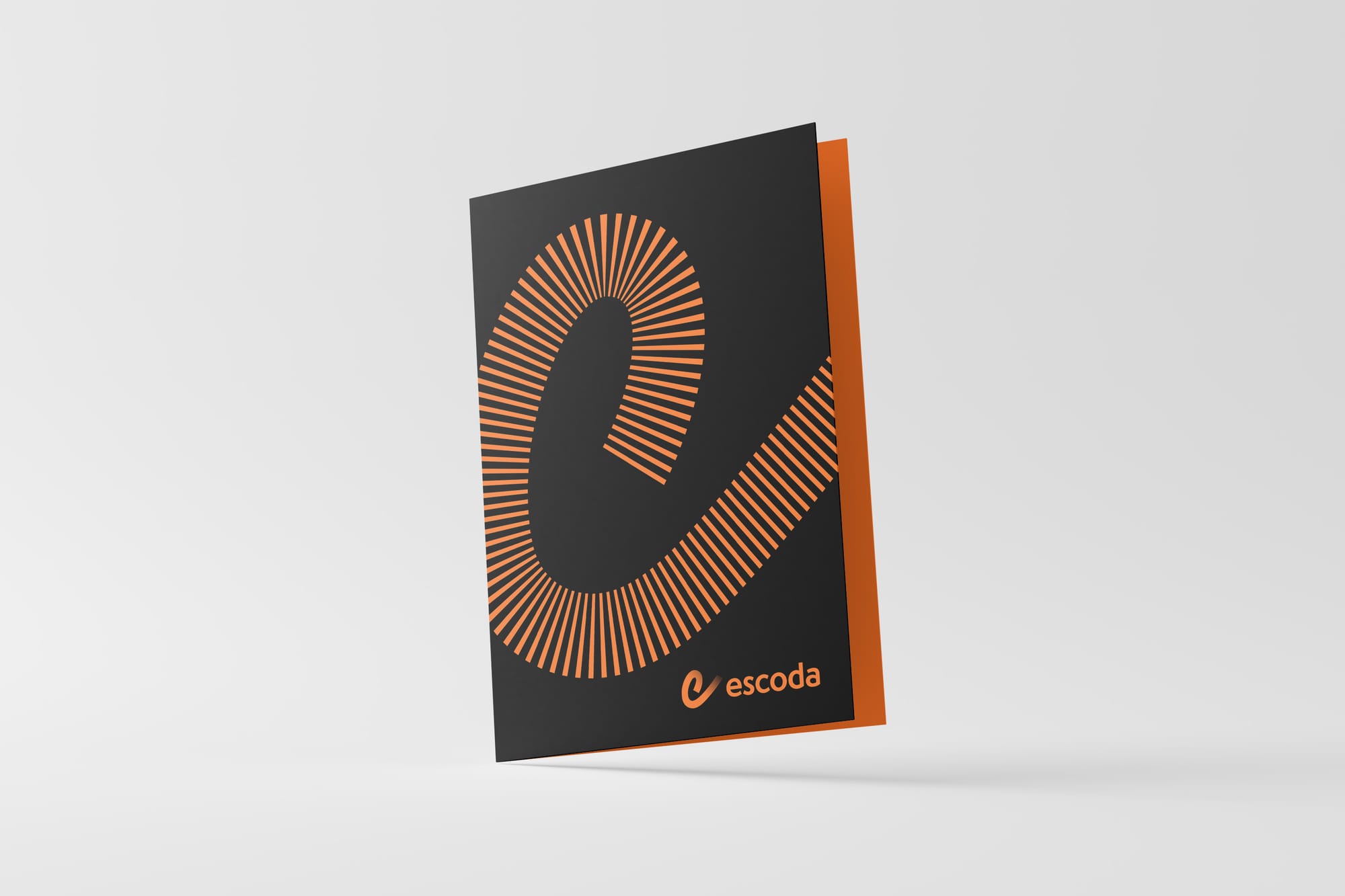 Assim nasceu o laranja Escoda (Orange Coda), uma cor vibrante e acolhedora que expressa movimento, calor humano e inovação. Associada a tons neutros de cinza e ao preto, essa paleta garantiu contraste e personalidade próprias, afastando‑se visualmente de outras marcas próximas e do setor.